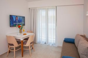 Minos Aparthotel is mooi en goed verzorgd en ligt achter het Minos hotel. Om bij het aparthotel te komen moet je door het Minos hotel en dit is erg gedateerd. In de gangen ligt versleten en vies tapijt. Er waren voldoende bedjes aan het zwembad en het personeel is vriendelijk. Uitzicht vanuit het aparthotel is slecht. Je kijkt tegen de achterkant van het Minos hotel. Hier hadden wij meer van verwacht als je de foto’s op de site ziet.