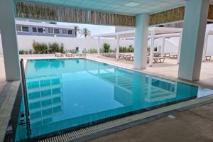 Personeel maakt dit hotel tot een aangename plek. Onze voorkeuren bij het boeken zijn bij aankomst meegenomen in de kamerligging. Dagelijks schoonmaak, opgemaakte frisse bedden en handdoeken. Ook nog aparte handdoeken voor het strand ! De slaapkamer is mooi ruim en prima stevige brede bedden. In de douche kun je gemakkelijk met 2 personen tegelijk in. De wc was gescheiden van de doucheruimte.  De wastafel was ook weer gescheiden, prima allemaal. De airco is bij de prijs inbegrepen en de temperatuur kun je zelf instellen. Het balkon was zeer ruim met 4 stoelen en een tafel. De keuken is vrij klein en de keukendeurtjes gaan nog steeds hard dicht. De wanden tussen de kamers zijn wel vrij gehorig, je kunt stemmen horen en geluiden van deuren bij de buren. Maar met de airco die staat te spinnen valt dat wel mee zodat slapen geen probleem is. Het zwembad is vrij klein. Er is een beperkt aantal ligbedden en een tafeltennistafel. De sportruimte is airco gekoeld. Er is geen eigen restaurant